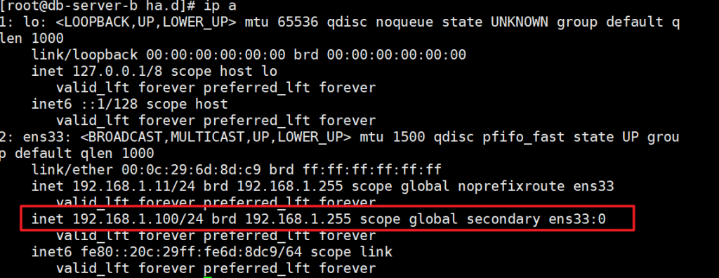 注:db-server-a是主服务器的主机名, db-server-b主机上不需要修改。这样资源默认会加a这个主机上。当a坏了,b会再接管。