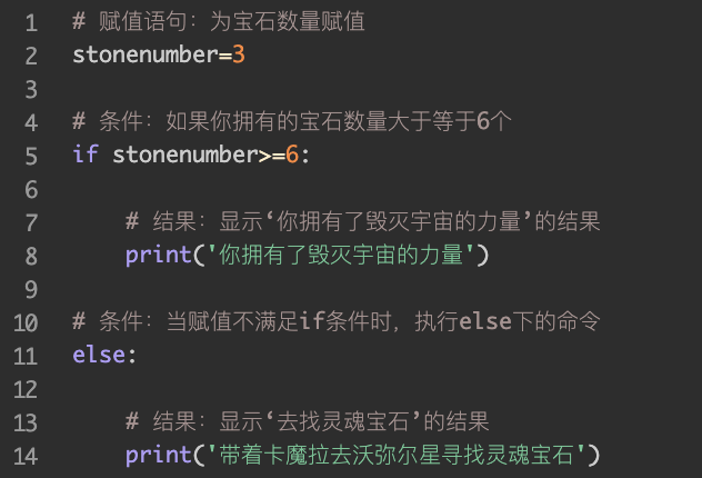 而由于赋值【stonenumber=3】,并不满足【if stonenumber>=6:】这个条件,所以不能执行【print('你拥有了毁灭宇宙的力量')】的命令,只能走第二条else:的路——执行print('带着卡魔拉去沃弥尔星寻找宝石')的结果